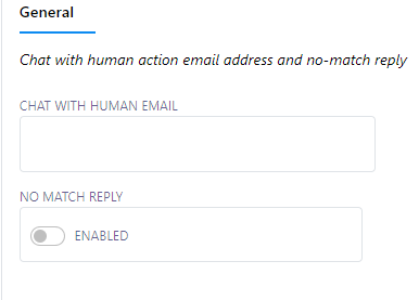 Chat with Human Email: In the `Chat with Human Email` field, you must provide an email address. When a user clicks on the `Chat with Human` button, an automatic email will be dispatched to the email address you`ve specified. This means that you will receive notifications via the provided email address when a use wants to initiate a conversation with a human agent.