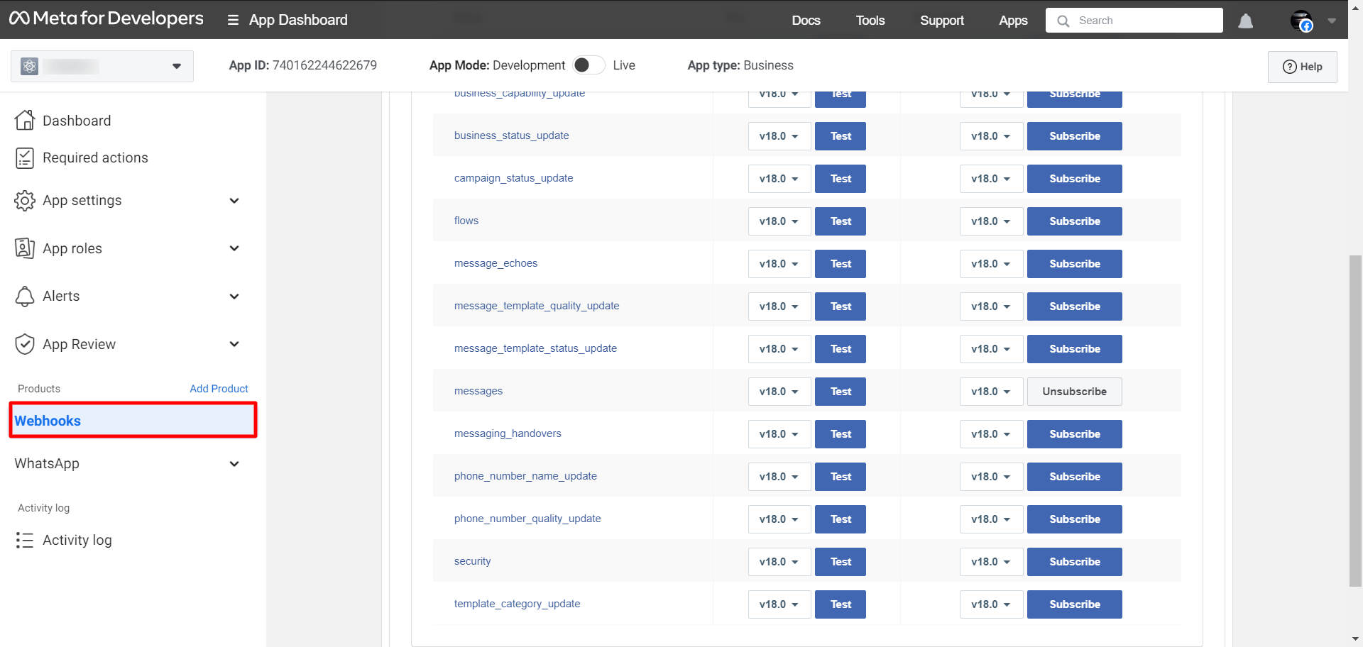 You can also subscribe and unsubscribe to webhooks on the webhooks page. Click on the webhooks menu and the webhook page will appear with some webhook fields. On the page, you can subscribe to and unsubscribe to any webhook field.